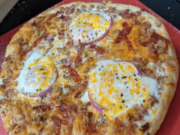Corned Beef Hash; Crumbled Sausage and Red Onion; Cheddar Jack and Mozzarella; Three Eggs with Bacon