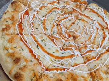 White Sauce; Shredded Chicken Breast and Buffalo Sauce; & Mozzarella with Sour Cream/Buffalo Sauce Swirls