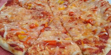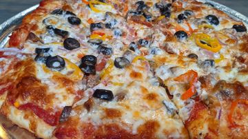 Red Sauce; Pepperoni, Sausage, Black Olives, Red Onions, and Red/Orange/ Yellow Sweet Peppers; & Mozzarella