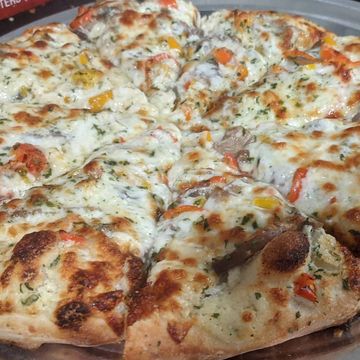 White Sauce; Black Olives, Drunken Mushrooms, Red/Orange/ Yellow Sweet Peppers, and Shaved Parmesan; & Mozzarella